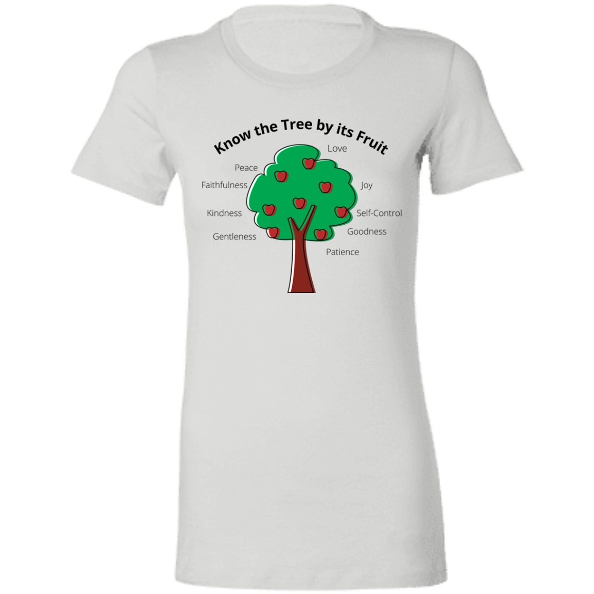 The tree at the center bears the classic virtues often known as the Fruit of the Spirit—love, joy, peace, patience, kindness, goodness, faithfulness, gentleness, and self-control. Arranged not as a list to memorize, but as fruit to grow, the design invites reflection rather than judgment.